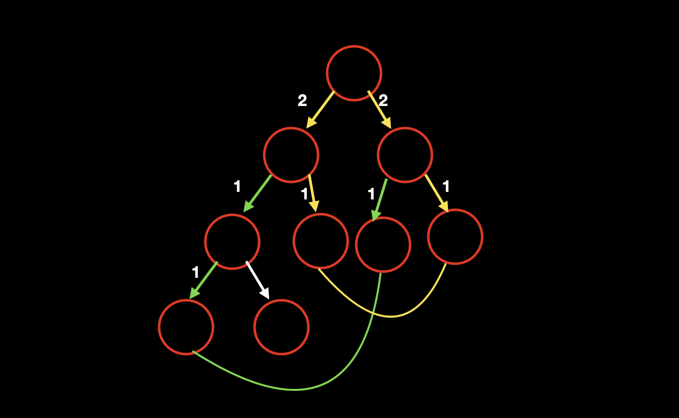 通过上图,我们可以发现有两条边既在绿色边组成的环里,又在黄色边组成的环里,因此他们的数字为 2。
