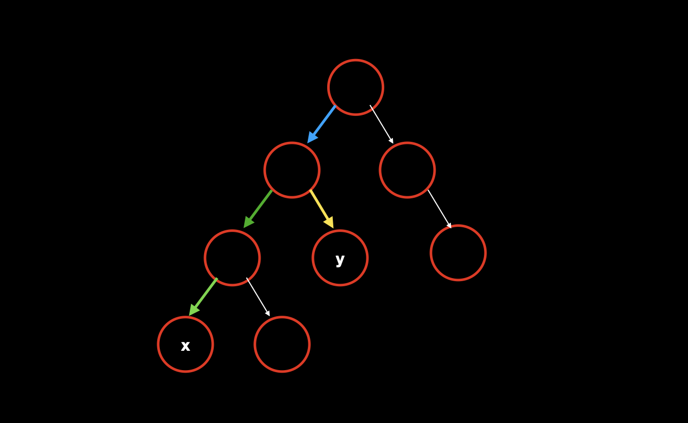图中黄色圈为 x 和 y 的公共祖先,而深度最大的那个即为最近公共祖先。特别要说明的,每个点自己也可能是自己的祖先,也就是说,假如 x 是 y 的祖先,那么就会有