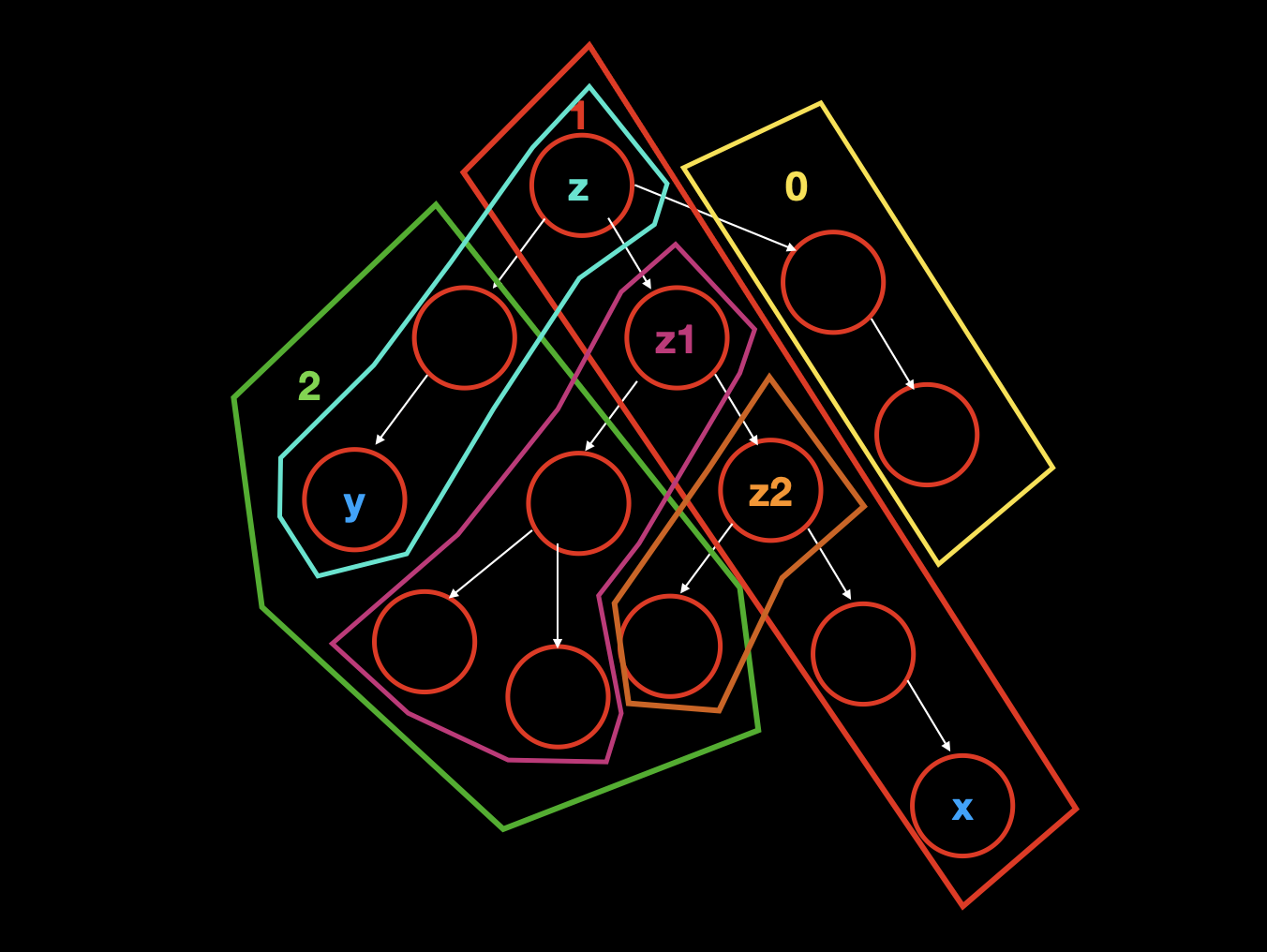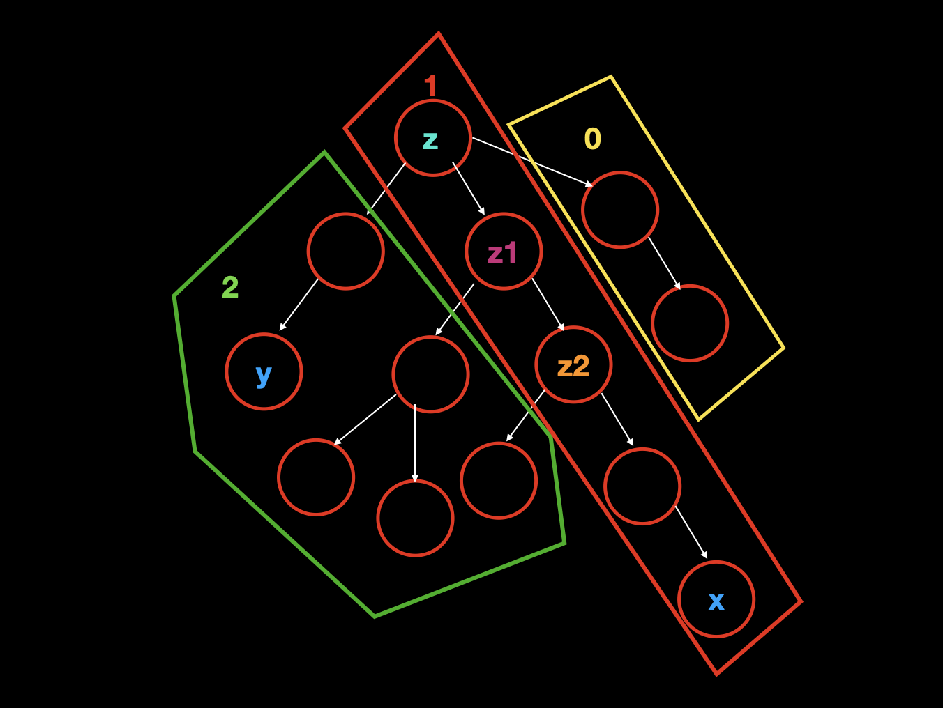 进一步的,我们神奇的发现 z 的所有子节点与 x 的最近公共祖先都是 z,依次类推,红色区域中,z 的所有子节点 (z1,z2...) 的所有子节点 与 x 的最近公共祖先都是 (z1,z2...) 它们自己。