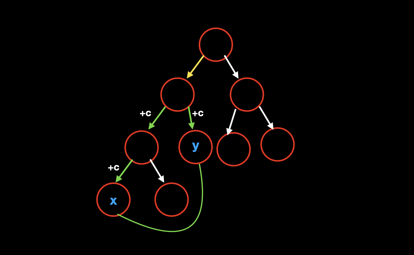 我们知道 d[x] 是 x 到根节点的距离,我们把 d[x]+c ,也就是把 x 到根节点的每一段都加上了 c,同理, d[y] 也是。那么,我们看图就可以看出来 d [x] 和 d [y] 实际上 都多加了一段黄色的部分,也就是他们的最近公共祖先到根节点的距离,因此,我们把这段减去两次,就表示 x 到 y 组成的环中,所有树边都加了 c。