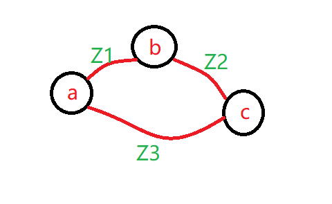 首先我们从 a 点出发,可以经过 z1 距离到 b 号点,经过 z3 距离到 c 号点。因此,目前我们可以得出初步结论 a 点到 b 点的距离是 z1,a 到 c 的距离是 z3;