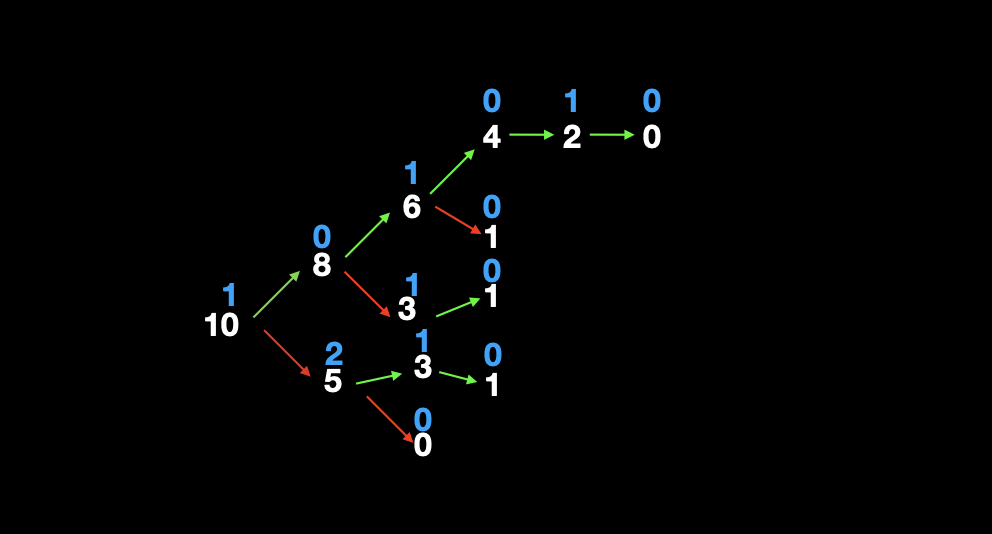 - 比如,把一堆 10 个石子,拆分成两堆,每堆 9 个,虽然总数变多,但是最大值变小,所以如此拆分下去,必定所有的都会变成 0。