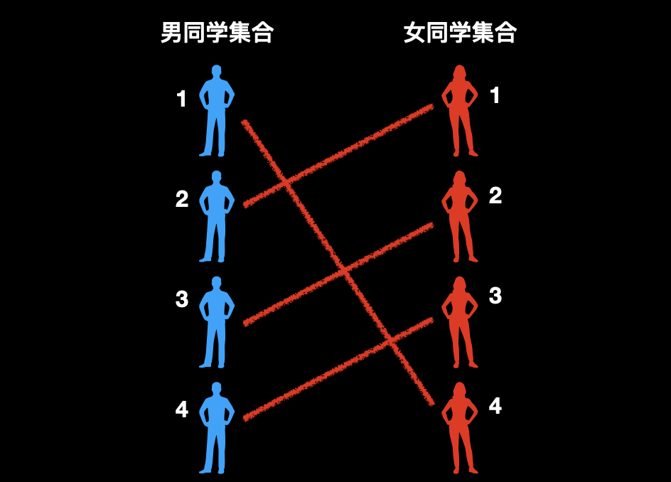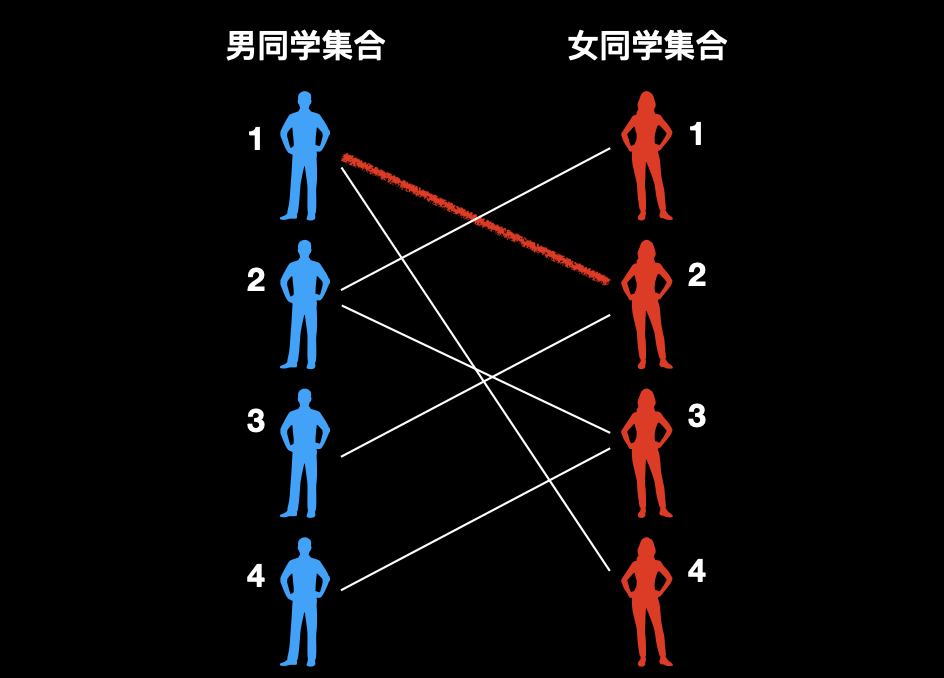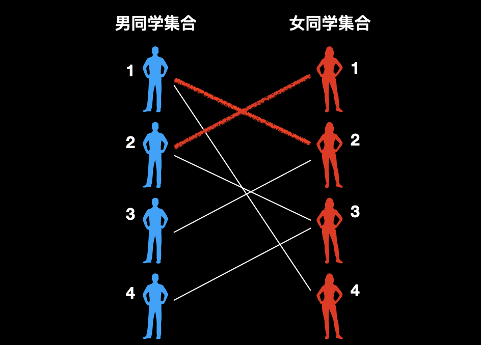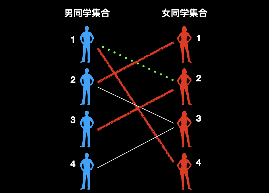 4、然后再把 1 号男和 4 号女配对,3 号男和 2 号女配对,皆大欢喜。
