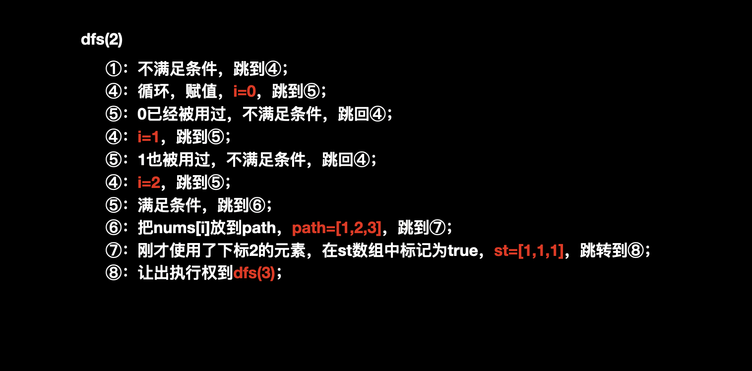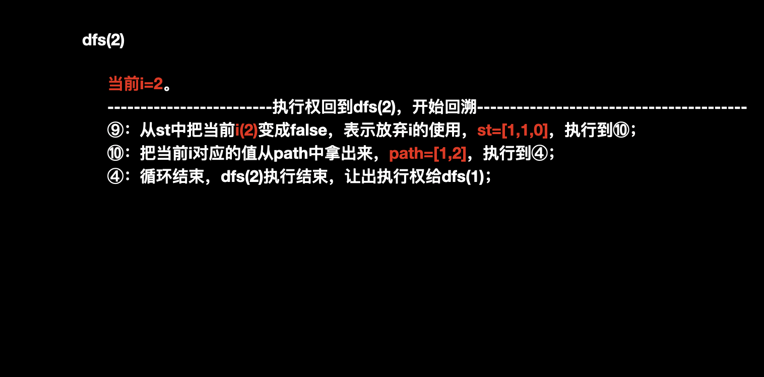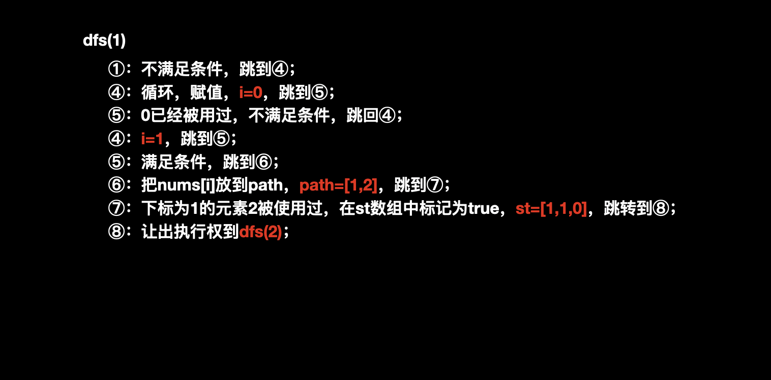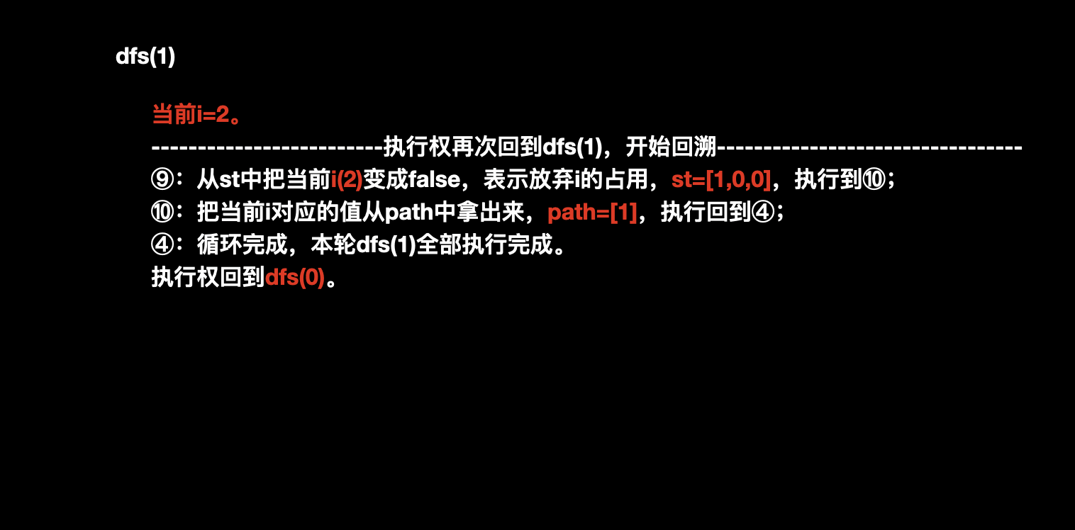 i的值是 1,那么在第 ⑤ 步回到 dfs (1) 的时候,dfs (1) 的变量i的值仍然是 1,并且从 ** 递归处(代码 ⑧)** 继续向下执行。