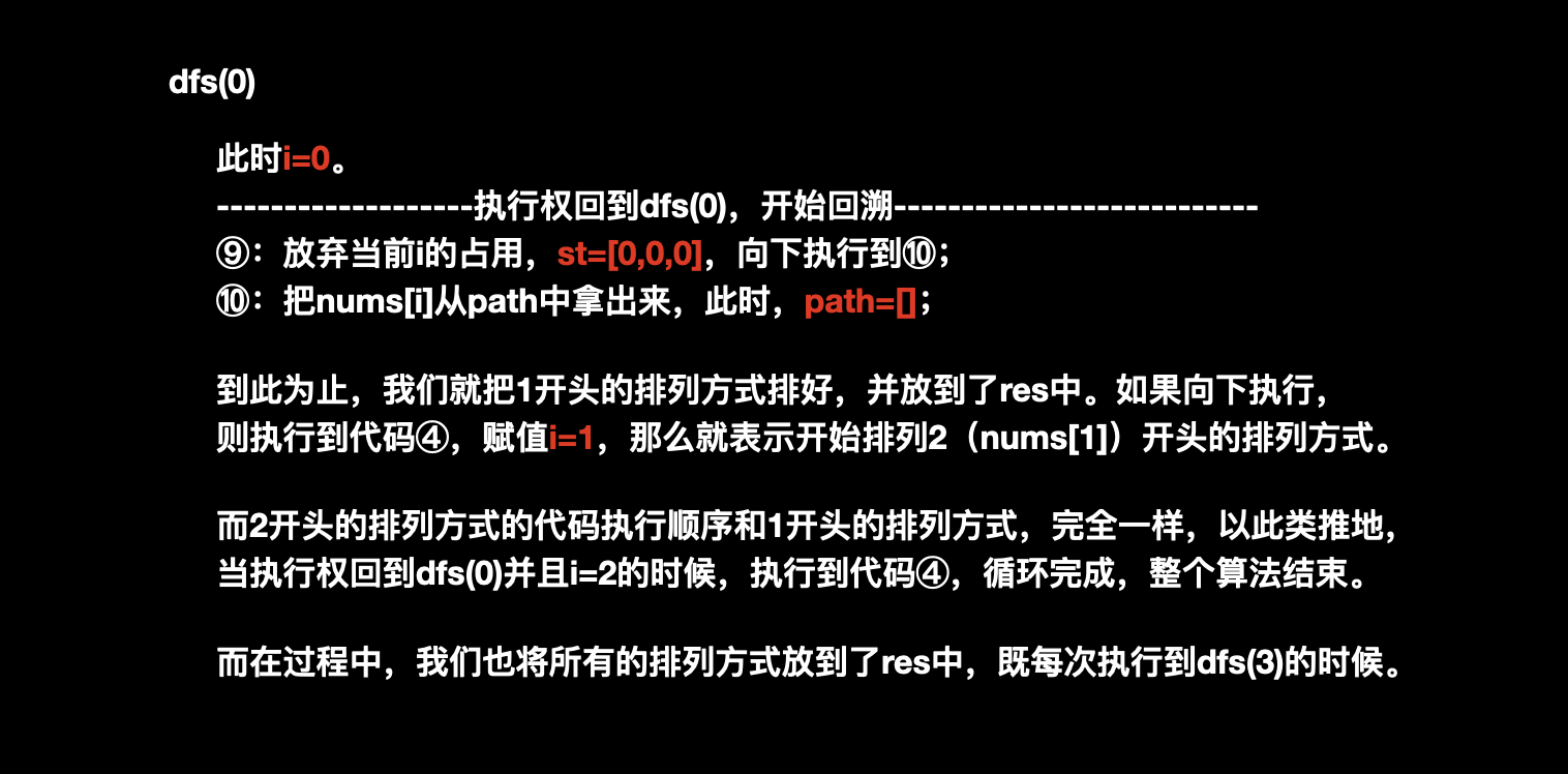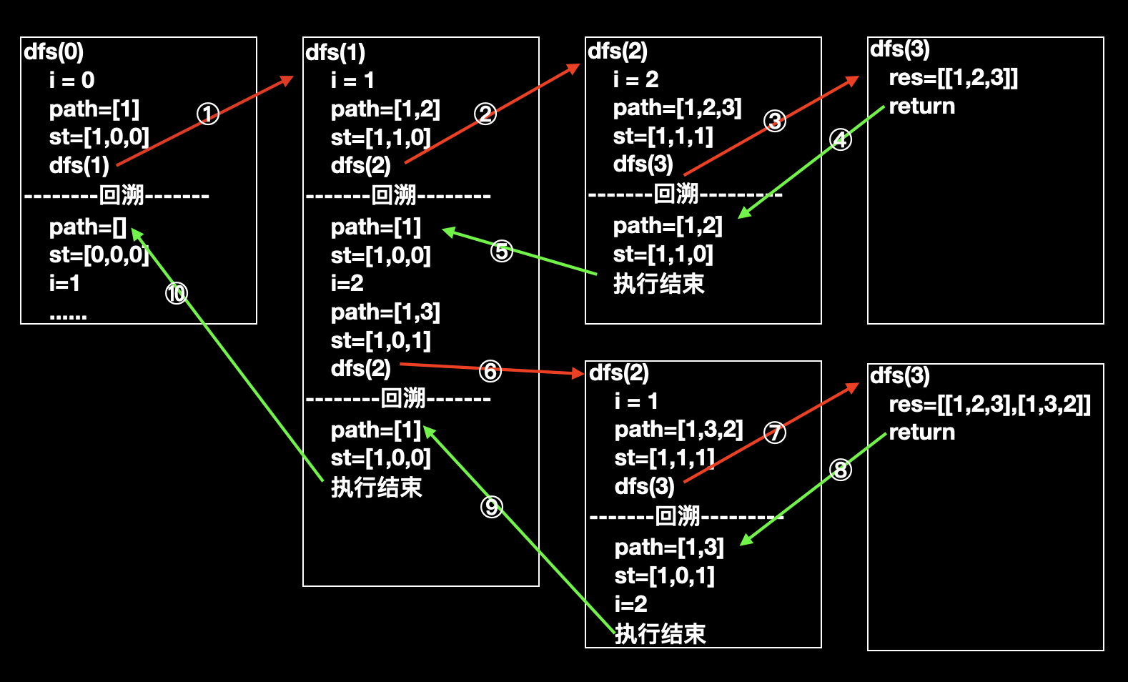 接下来是本文重中之重,我们来看一下上面的代码的完整的执行流程,以此来了解为何这样写就能完成回溯。