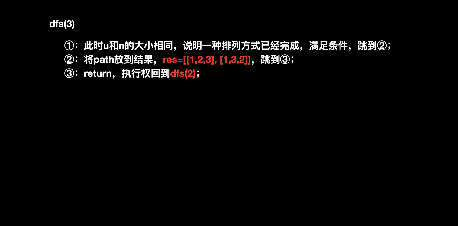- 明确递归函数的含义,递归函数最重要的就是其表达的含义,而在上面代码中,递归函数 dfs 的含义是深度优先搜索,当搜索到一个结果之后,就把结果加入到结果 res。