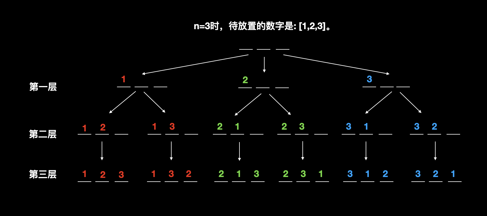 1 2 3,总共三个数,所以有三个位置,我们把1放在第一个位置,那么第二个位置可以放2或3,无论第二个位置放哪一个,第三个位置都只能放另外一个,而当三个位置都放完就找到了一个完整的排列方法;- 以此类推的,如果第一个位置放 2,那么第二个位置有两种放置方式;