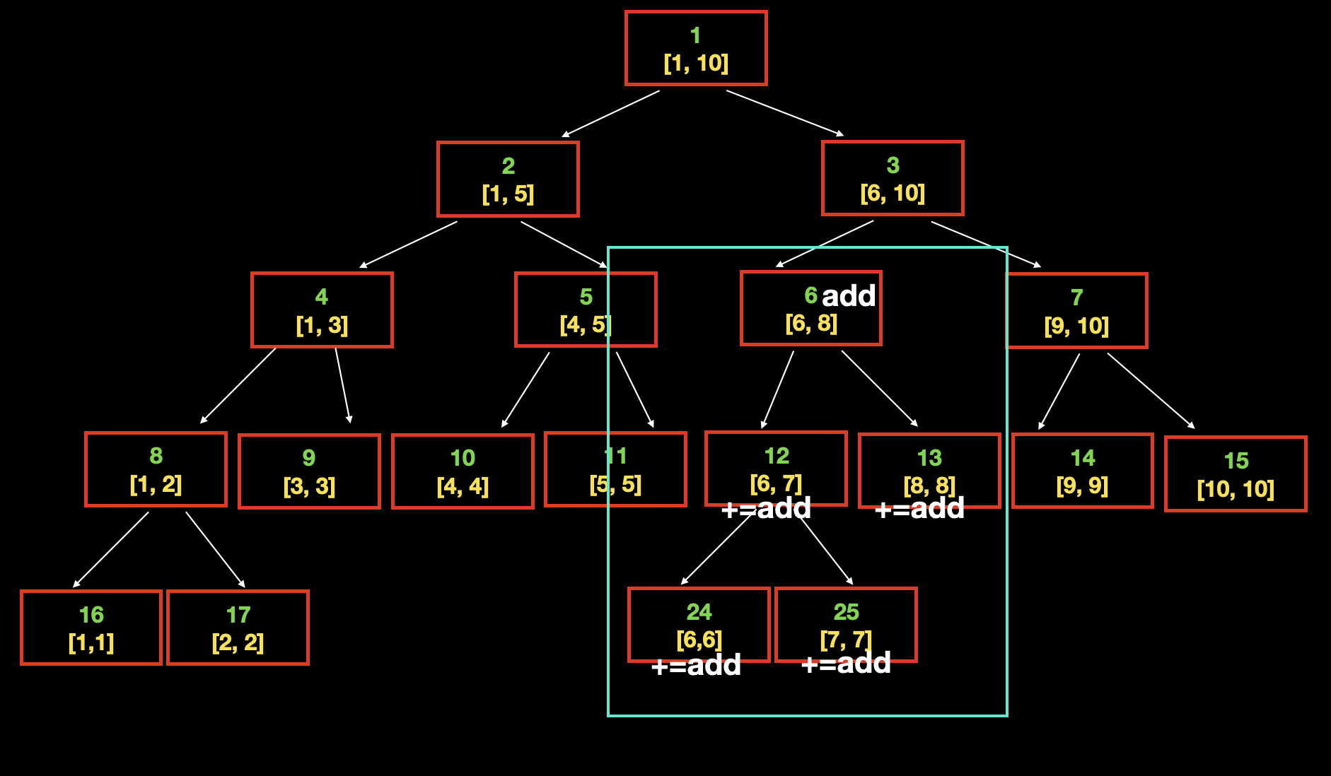区间修改同样可以使用类似的思路。只要 当前搜索到的区间 已经包含了 需要修改的区间,就不再继续搜索,而是在当前搜索的区间打一个标记 add。