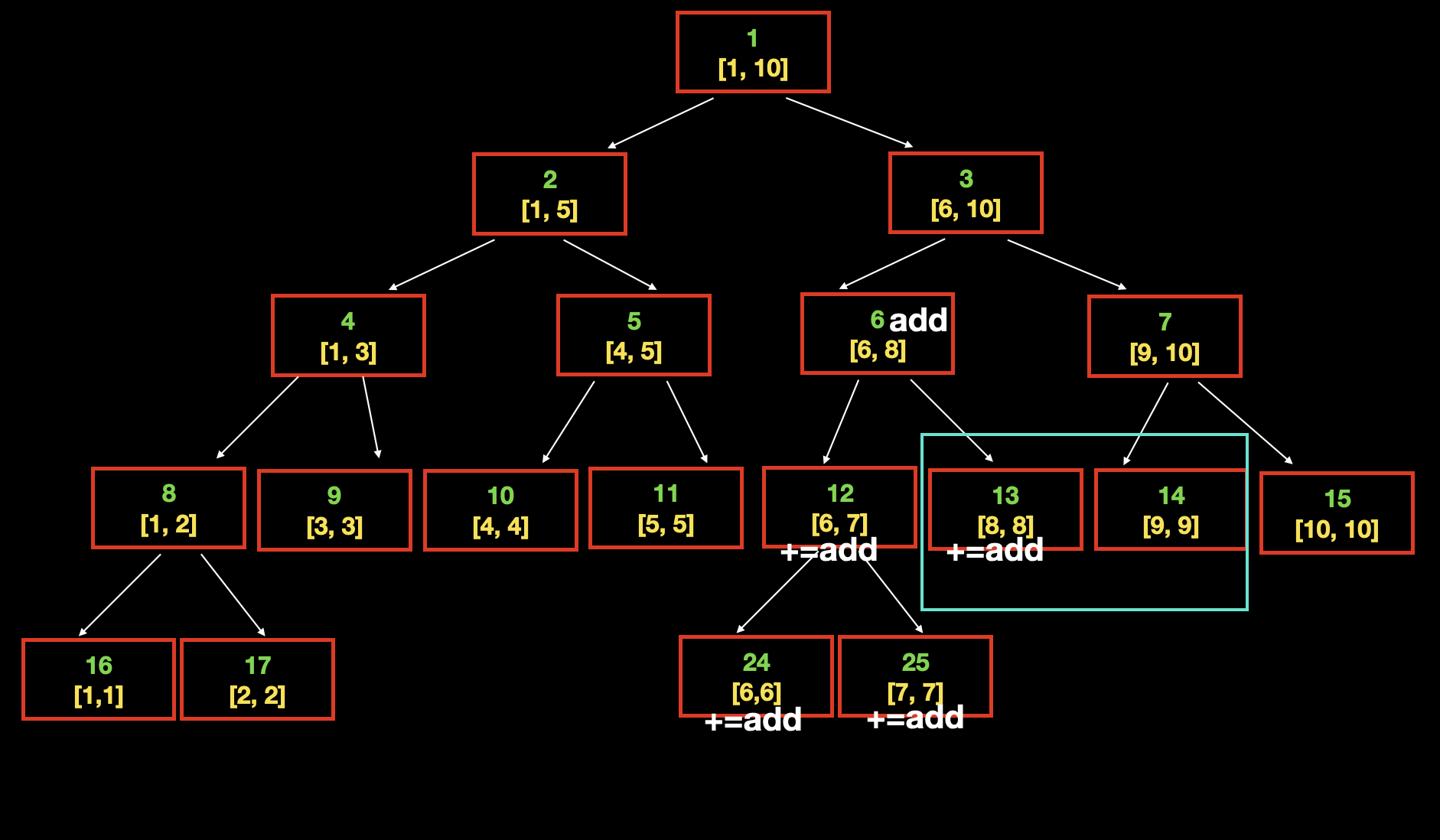 这样就保证了在计算当前节点的时候,它的所有祖宗节点上的标记都已经累加到了当前节点。也就是说 我们查询到 13 号节点的时候,它的六号父节点上的 add 标记已经计算到 13 号节点上了。
