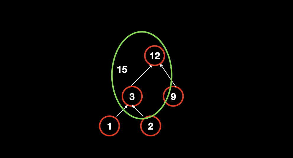 最终结果是 15,其中节点 1 和节点 2 分别被计算了两次,节点 9 被计算了一次。