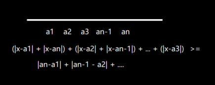 如果我们想让组 a1, an 取到最小值,那就取他们的 中间 ;想让 a2, an-1 取到最小值,也要取他们的 中间 ,以此类推。并且我们发现当数轴上有奇数个数的时候,他们的中间就是中位数,当数轴上有偶数个数的时候,他们的中间是最中间区间内的任意数