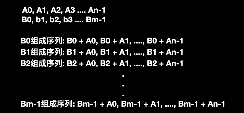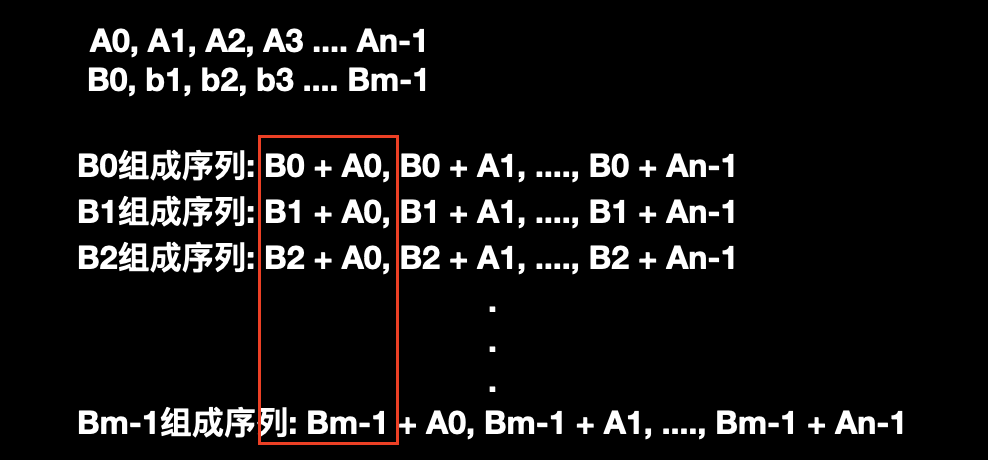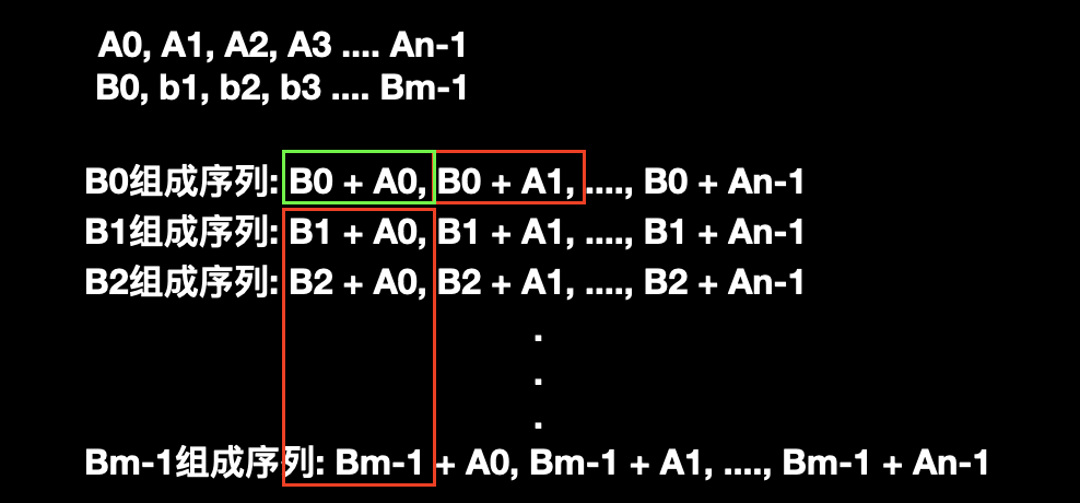 从图中可以直观的看到共组成了 m 个新序列,而每个新序列中 B 是不变的而 A 在递增,所以每个新序列也是递增的。
